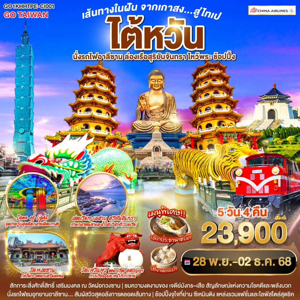 | 5 | ร้านสร้อยสุขภาพ – อนุสรณ์สถานเจียงไคเช็ค – ตึกไทเป 101 – วัดหลงซาน – ร้านขนมพายสัปปะรด – ช้อปปิ้ง MITSUI OUTLET PARK – ไต้หวัน (สนามบินนานาชาติเถาหยวน) – กรุงเทพฯ (สนามบินสุวรรณภูมิ) (CI837 TPE-BKK 22:40-01:25+1) | ✔ | ✔ | ✘ |